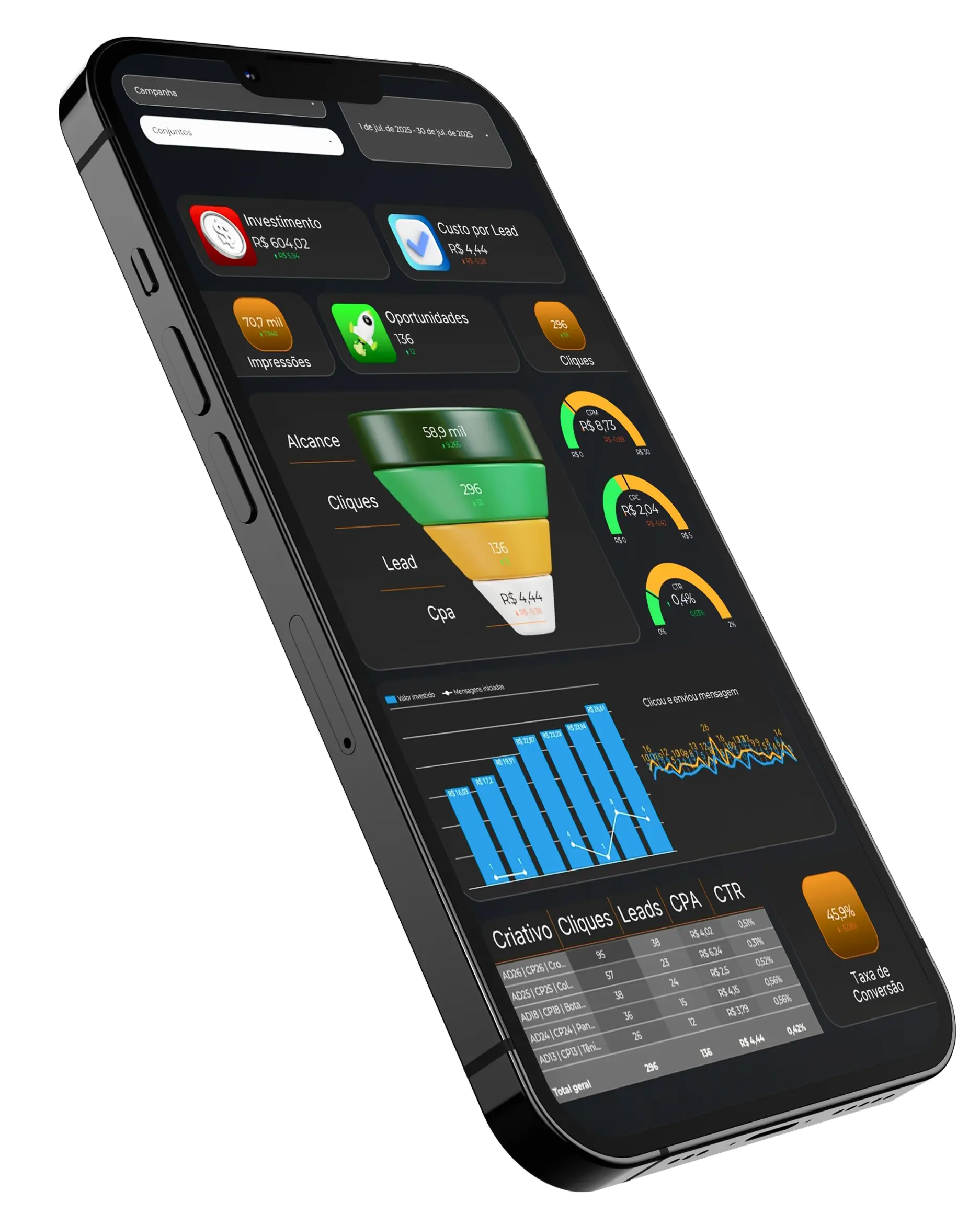 Campanhas ativas com objetivos claros: atrair, qualificar, vender.